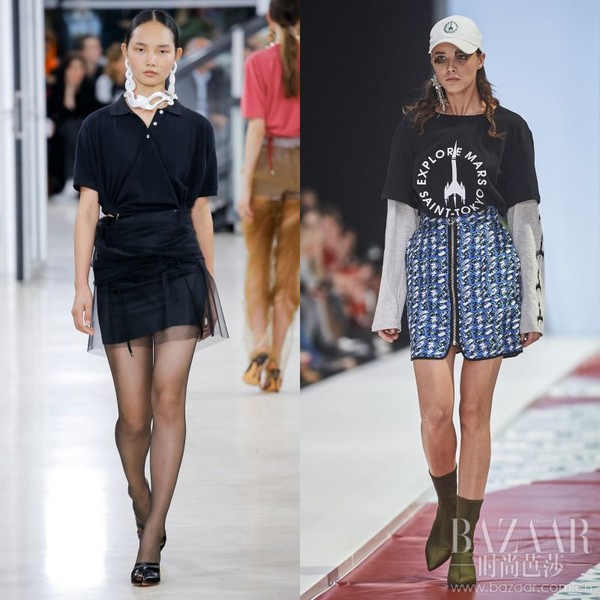 Y/Project 2018春夏系列将基本款黑T跟纱裙搭配酷中带柔,而Saint-Tokyo 2018春夏系列同样用柔软属性的毛呢裙中和了黑T的酷。