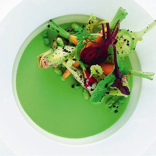 【时尚芭莎网讯】李东宸 ↑↑↑绿色酱汁打底,点缀红萝卜、紫洋蓟、碗豆等春季蔬菜的鲜艳色泽,5:5的精致比例,在视觉上完美平衡。 ↑↑↑交错的黑色树枝,粗糙破损的瓷器餐具,呼应着盘中看...