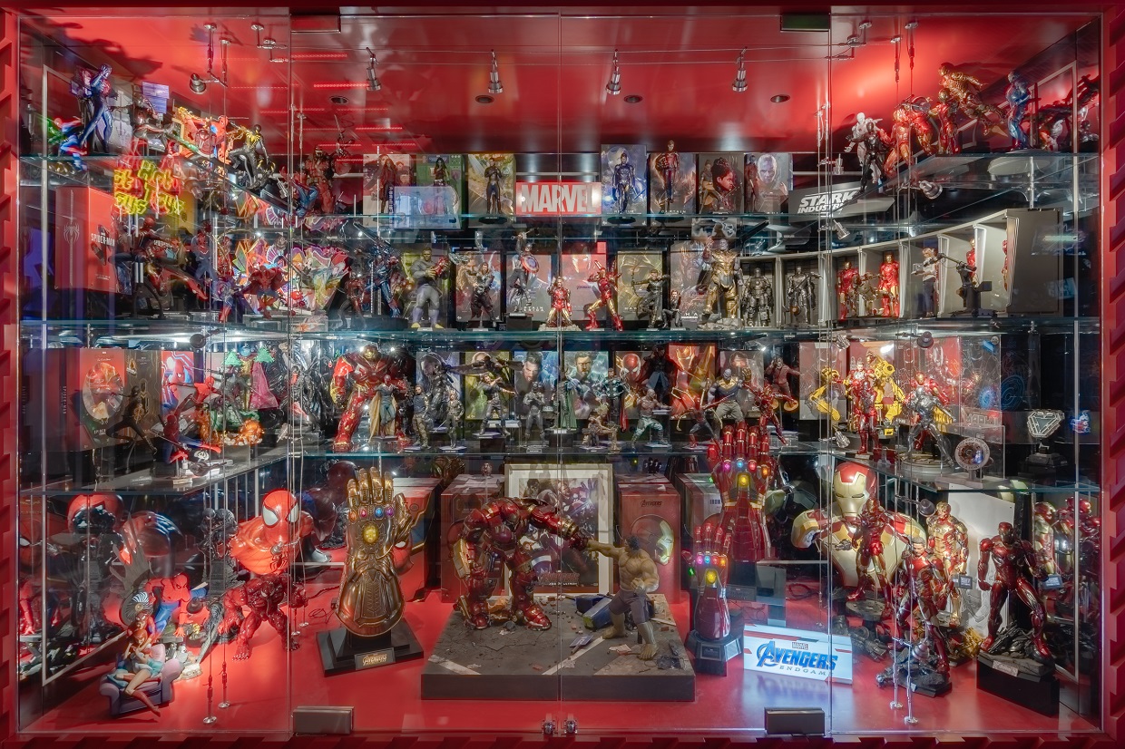 位于店铺前厅的独立玻璃展厅内,赫然陈列了约一百款由Hot Toys打造的漫威系列稀有的1:1, 1:4 及1:6珍藏人偶。不论是超高人气的蜘蛛侠,还是从“复联”经典六人组、《银河护卫队》成员、《毒液》等各系列电影角色,漫威MCU宇宙各个经典人物,搭配着电影场景的还原,让一众“漫威粉”们惊喜不已,开启旗舰店的第一波震撼。