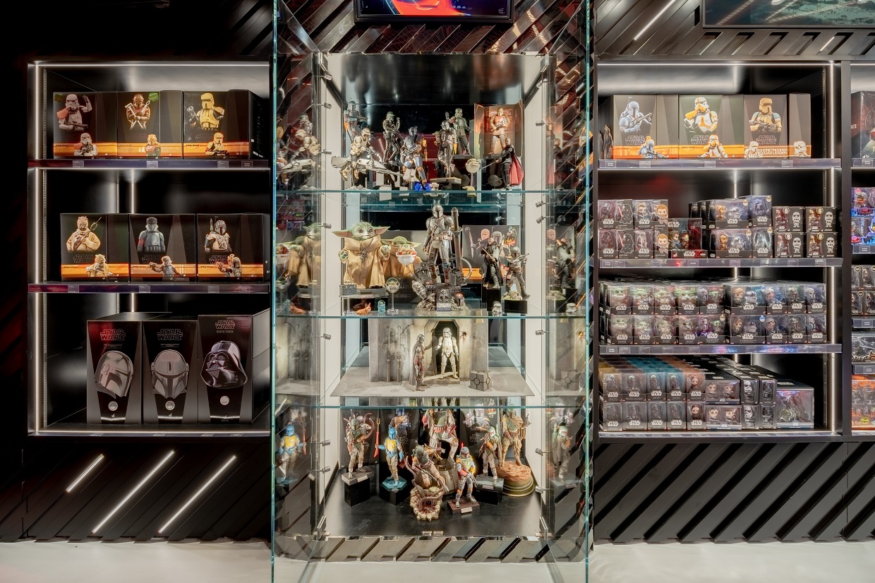 位于店铺一楼的星球大战展柜中的是拥有超高口碑的《曼达洛人》角色系列产品。人气“奶爸”曼达洛人丁·贾伦、超可爱的尤达宝宝“古古”、赏金猎人波巴·费特、大反派吉迪恩总督等珍藏人偶细节满满。