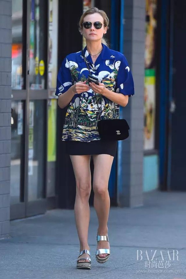 Diane Kruger穿着Hawaiian shirt搭配一条黑色短裙,背着Chanel家包包,再配一双银色凉鞋,轻松活泼又时髦随意!