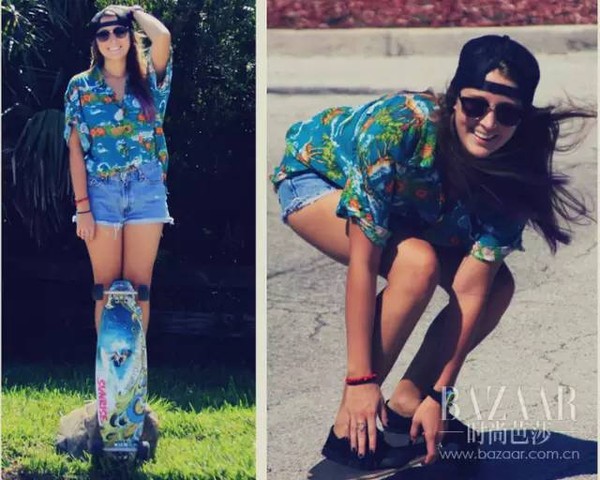 穿着夏威夷衬衫搭配牛仔裤去玩滑板的酷女孩,可真帅呢!