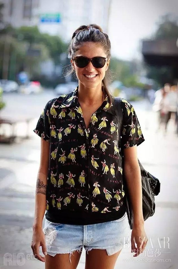 充满了热带风情的草裙小人图案,搭配一条牛仔裤俏皮又可爱!