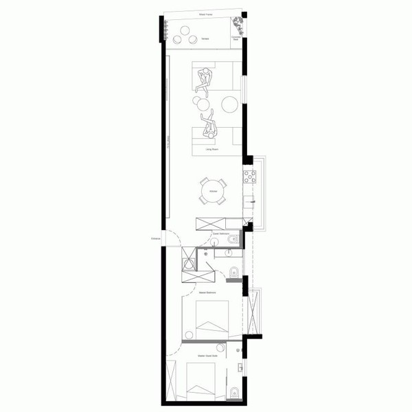 △ 长形尽头的阳台设置了吧凳,可以在闲暇时光俯瞰城市的繁华