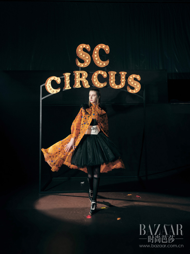 款式上除了堆栈的裙装,也按着马戏团中魔术师形象为灵感,出现许多中性挺拔轮廓套装,西装背心、灯笼裤、伞状西装外套等单品,以及风格一致的尖头拼接系带穆勒鞋、尖头拼接单鞋搭配,侧写出女魔术师率性浪漫并具的模样。