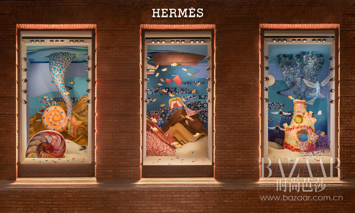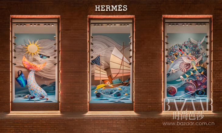 奇趣橱窗以双面视角带领观者挖掘海平面 上下的迷人风情。 爱马仕全新系列臻品串联于浩瀚海波和奇趣生物之中,邀请观者怀揣好奇果敢扬帆踏上探险旅程。