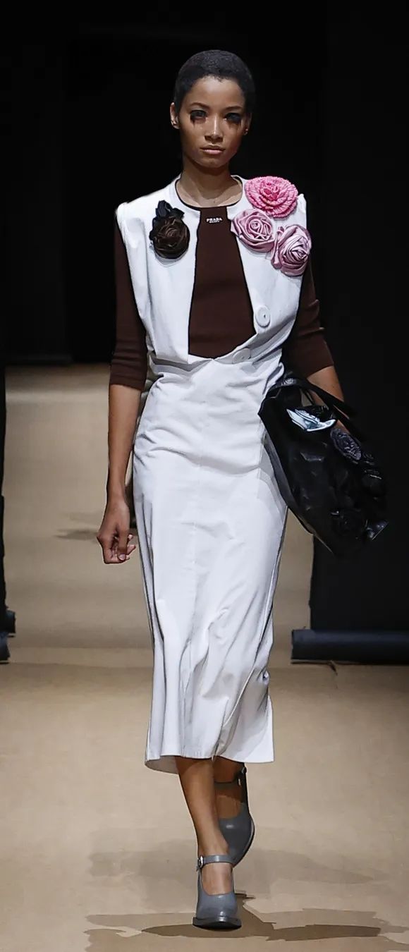 极简的黑白灰色系套装,依然是熟悉的Prada标志性流畅廓形。但点缀胸前的玫瑰花卉、后背的蝴蝶结,却是浪漫夸张的一笔,谁说极简主义不能谱写自己的幻想曲呢?