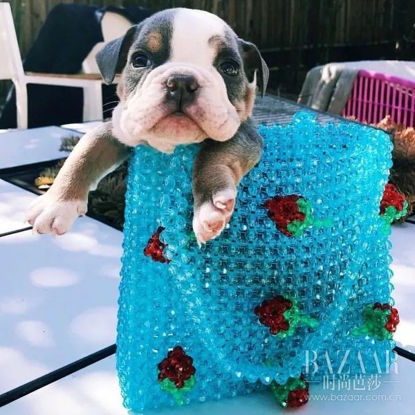 白色珠子铺底,几颗红绿相间的樱桃点缀,像是小时候的手工劳作。在“小马哥”的手上一拎,再配个墨镜,居然迷之可爱!芭姐不禁想要打探一下,她得有多“有趣”,才会想到把这个包拿在手上!