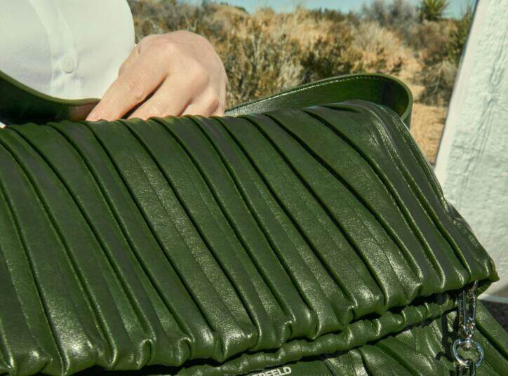 第一种名为Desserto的材质来自墨西哥,是一种具备社会可持续性且可再生的仙人掌纯素皮革,以植物为原料,含有丰富有机碳。因种植过程无需浇灌而节省了大量水资源。栽培过程中亦不使用除草剂、杀虫剂等化学品。K/KUSHION手提包经有机染料染色,绿色款带有如靠垫般的蓬松质感,表面打褶装饰;黑色款则表面光滑无接缝。