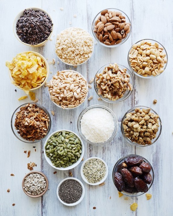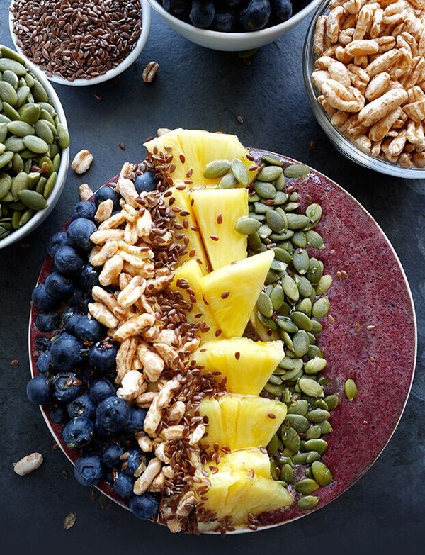 摆料:蓝莓、麦片、亚麻籽、菠萝、南瓜籽