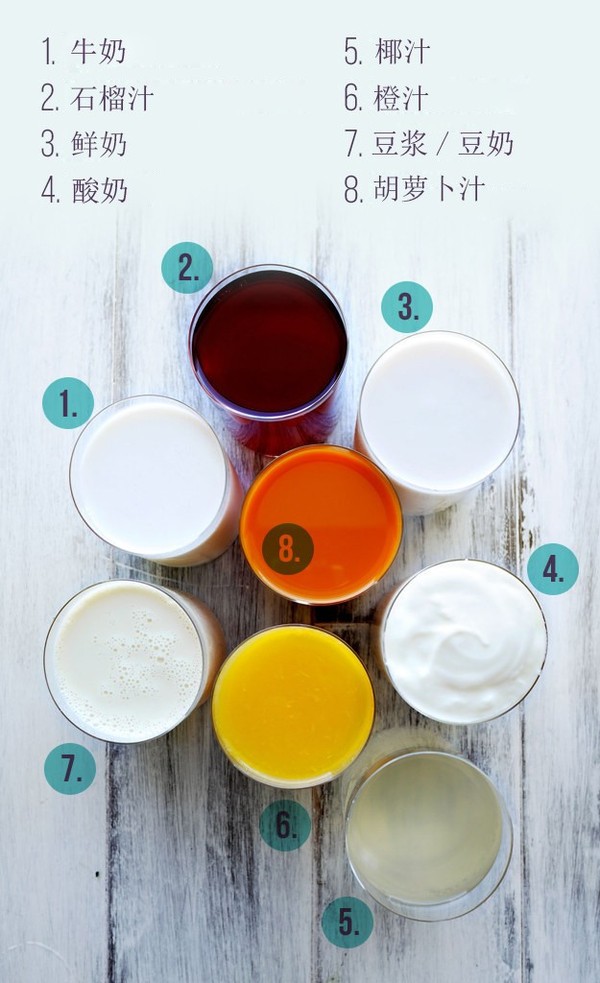 加入1/2杯的这些液体,每一个都会带来很棒的口感!