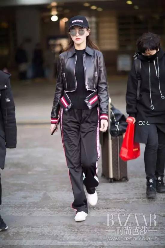 唐嫣身上的条纹元素在衣摆处——垂在两侧的可拆卸条纹衣摆。拆下后便是打造大长腿look的短款皮衣啦!