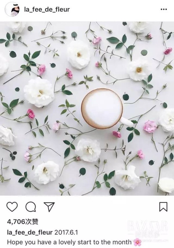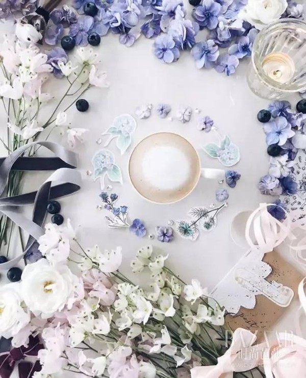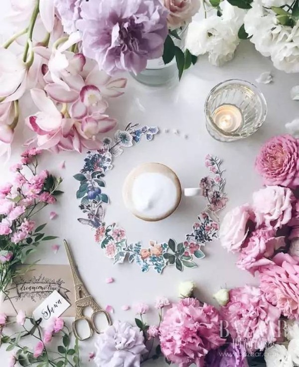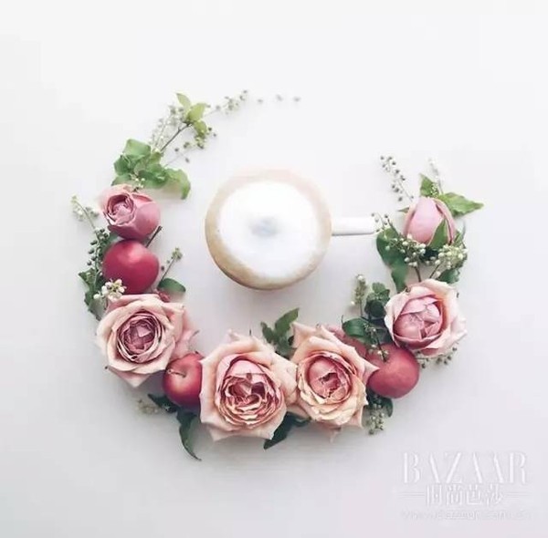 她会在咖啡周围精致地摆上各式各样的花环,于是乎原本简单的下午茶时光,瞬间就被她装饰得诗情画意。