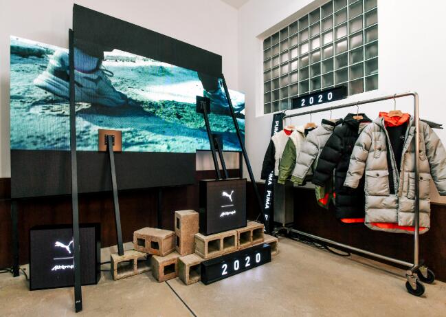 踏入下沉式阶梯进入室内空间,极富现代感的PUMA X ATTEMPT“档案室”冲击视线。左侧层叠错落的潮流型录个性诠释本季联名的鲜明风格;右侧以不规则石柱装置营造工业感,陈列RS-2K、Centaur、Oslo Pro和Style Rider四款PUMA X ATTEMPT联名鞋款。本季联名系列鞋款将天然材料与反光材质巧妙结合,以创新重组的解构主义元素打造夺目细节,在极简设计中暗藏“玄机”。