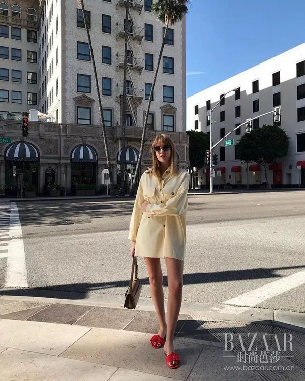 所以不太高的Aimee Song也要这么穿▼。衬衫裙的透视与“渔网鞋”的呼应已经足够吸睛了,她还是要解开两颗扣子把腿露出来才知足!再用腰带将原本松松垮垮的腰身固定,腿看起来长到不行~