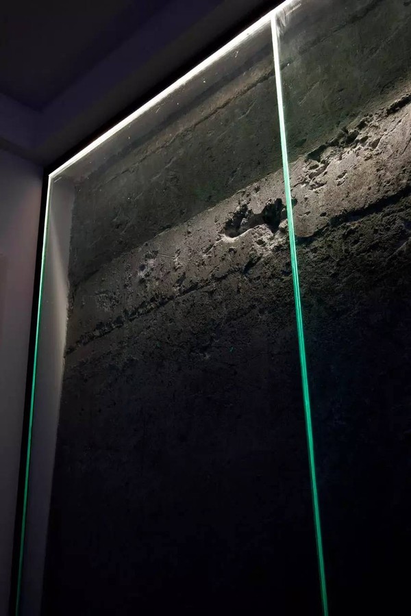 ▽ 浴室里有一面突出“原始味道”的墙,被封闭在玻璃中并伴随照明