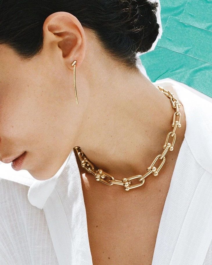 除了时装品牌外,很多珠宝品牌也都早早的推出了这样的Chain Necklace,比如Tiffany就推出更为秀气优雅的细锁链,宋祖儿脖子上这条就是两条手链拼接而成。