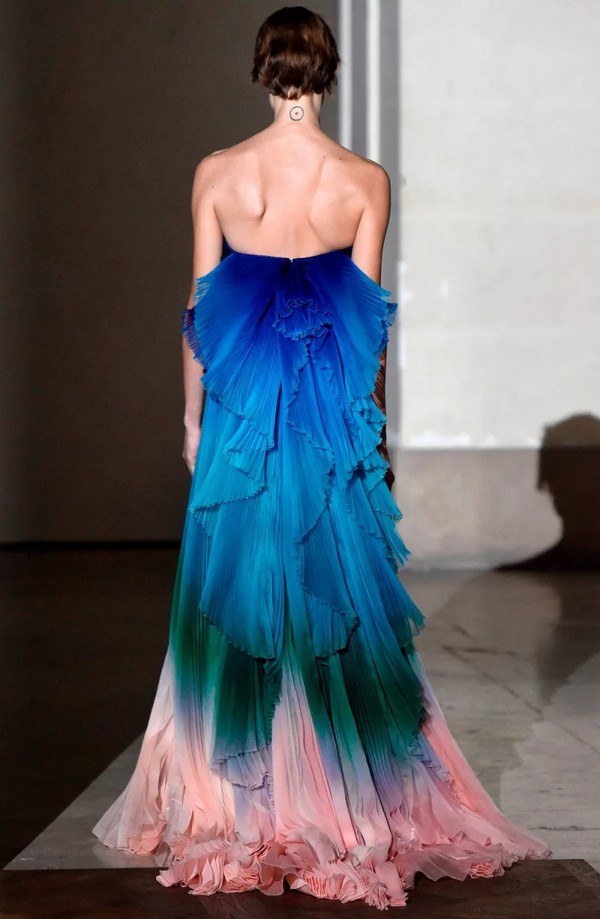 “这两条彩虹色的晚礼服花了最多的时间(制作)。首先需要一个经验丰富的工匠把30米长的白布手工染上颜色,并进行2~3次调整才能做出我们最终理想的色调。接着,这些面料需要被送去做出褶皱,最后才能用来做衣服。我们大概花了三周的时间,仅仅用在制作面料上。”工艺仍然是Givenchy高级定制核心中极其重要的一部分。Clare对此倍感骄傲。