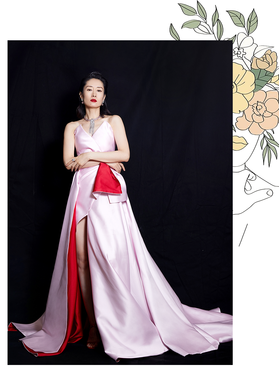 刘敏涛绝对是今年杀出的宝藏女王,除了自律的身材以外,她那不明觉厉的自信驾驭任何服装都不在话下。Renee的这条围裹式抹胸裙,利用抓褶和双色面料谱写出玫瑰的生命力。腰间的一抹猩红点缀,如同敏涛姐唱的《红玫瑰》一般冶艳。