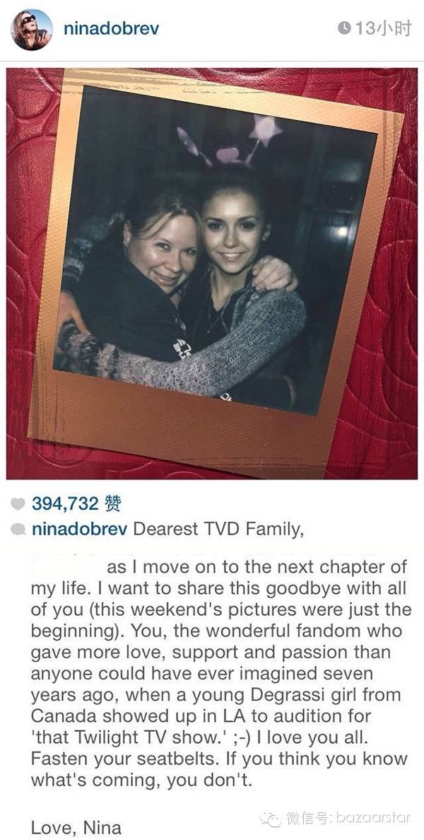 【时尚芭莎网讯】小孟 美剧《吸血鬼日记》的女主角妮娜·杜波夫宣布退出第七季的拍摄。 而一周前伊恩和在饰演《暮光之城》爱德华姐姐的妮基·瑞德领证结婚。妮娜退出,伊恩结婚,这回是真的要和陪伴了我们六年的《吸血鬼日记》说再见了。...