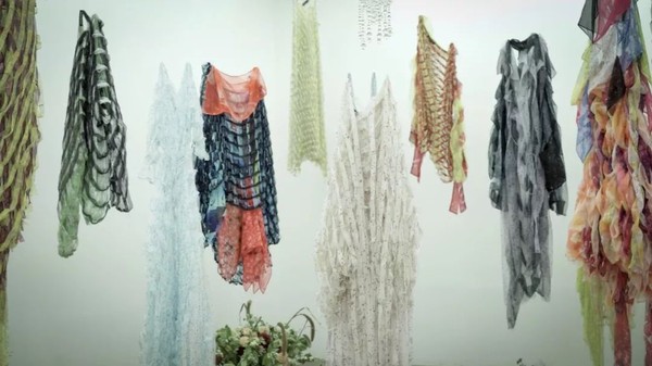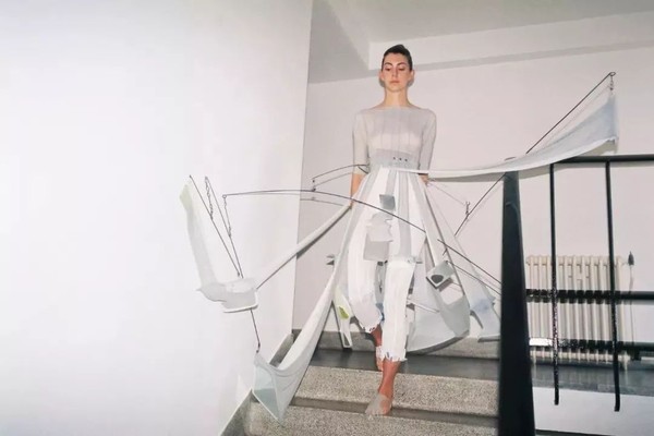 在巴黎举办的Presentation(时装静态展示)中,Susan把时装高高挂起,不同的固定点让衣服延伸出更多样的形态。