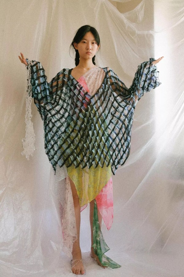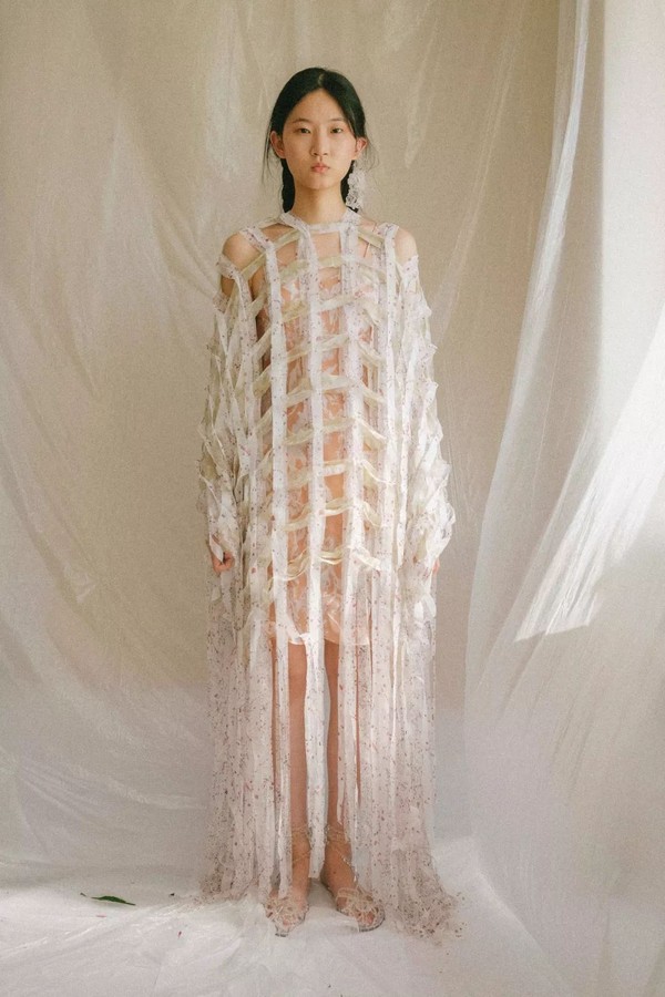 Susan Fang发现这种融合了空间几何的布料形态完全能实现“让衣服具有生命力”的概念。在2019年春夏系列里,她使用更加轻盈的纱质面料,通过数次尝试,摒弃由铁丝支撑而成的立体廓形,而是用更复杂的编织手法让布条进阶至3D模式,直观地呈现方形几何体的线条和阴影,造就独一无二的躯体律动。