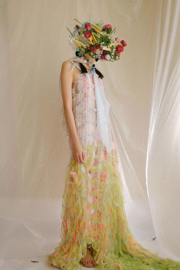 宫殿庭院里成片树荫被风吹动时晃动的光影,被不小心踢到而滚动的碎石和路边遗落的花朵……大自然里纯粹的景致是她眼中最美的存在,Susan Fang为此设计了五十多种印花图案。当然,图案制作的方式也很多样,从最简单的图案手绘、把彩色纸张裁剪成花瓣后扫描成花纹二次利用,再到把鲜花铺洒在基础面料上,反复喷漆留下它们的剪影。花朵元素也延续到了秀场布置中。几块置于屋顶的巨幅印花帐幔也全是手工喷漆完成,不惜毁坏了妈妈的花园,但也把花卉最真实的形态保留了下来。
