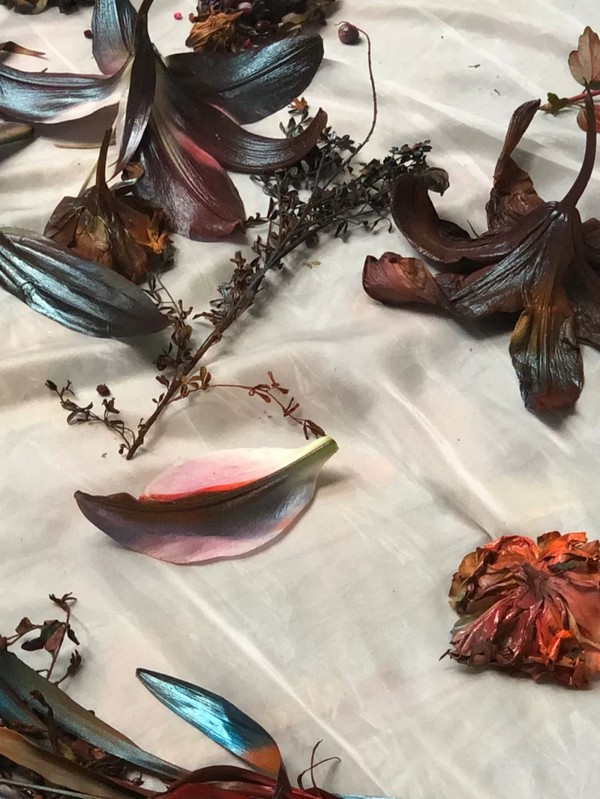 把鲜花铺洒在基础面料上,不断移动花朵散落的位置并反复喷漆