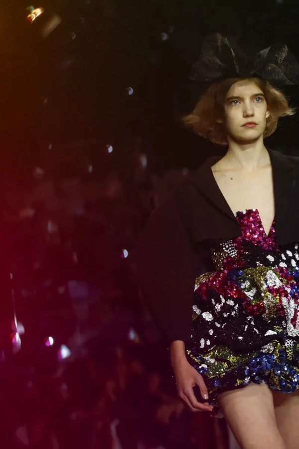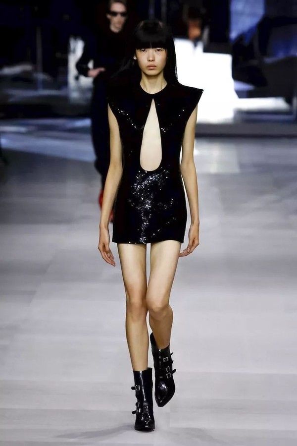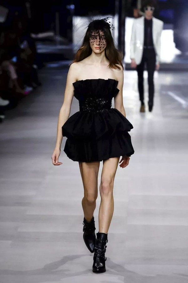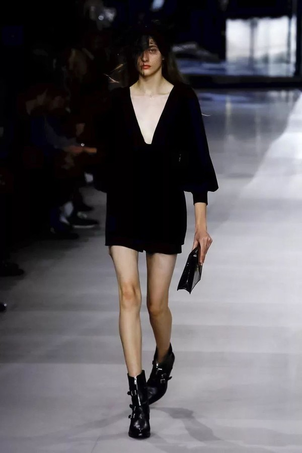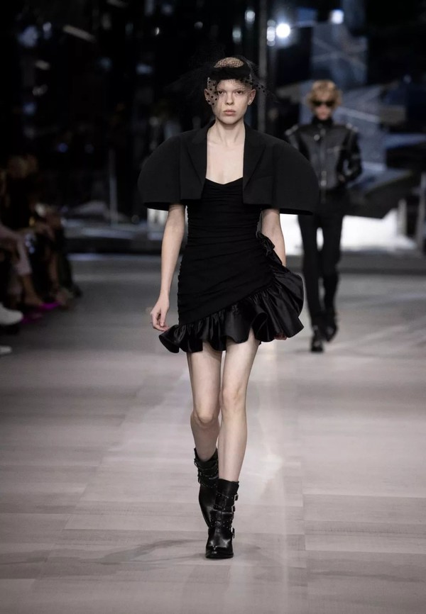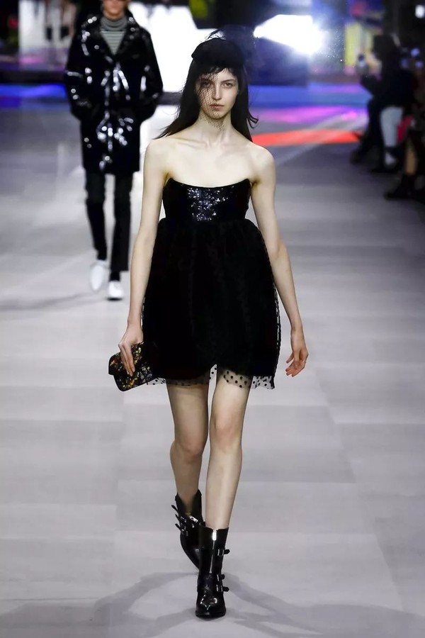 此次HediSlimane的CELINE首秀在巴黎荣军院举行,随着La Femme的《Runway》响起,由Slimane本人设计的装置打开,来自英国的Hanna Motler为本季开场。她穿着一件短至大腿根部的波点露肩迷你裙,外面装点着一个硕大的蝴蝶结,头上还带着有网纱的礼帽。无论从哪个角度看,都像在拆开一个礼物。