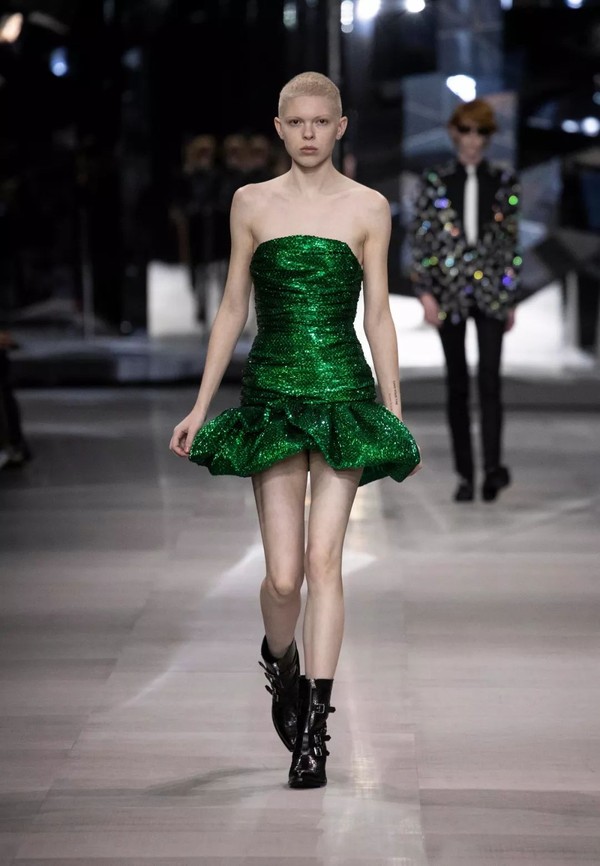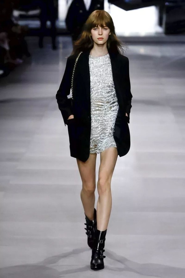 Hedi Slimane将一种强烈的巴黎精神带到了在CELINE的首秀,他出生在这儿,在这所城市的日夜滋养之下成长。巴黎之所以称之为光之城,就是因为它的夜晚比白天还要美丽,Slimane深知这一点,并将此融入在自己的设计语言之中。晚装部分,他展现了四条比迪斯科球还要闪耀的鸡尾酒裙。鲜血般的猩红色、像毒药一样的绿色以及他挚爱的金银二色,在整个系列中就像四颗闪闪发光的恒星。