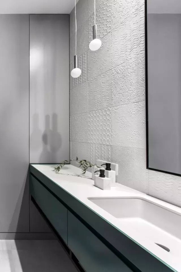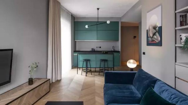 整个公寓均使用黑色金属,开放式厨房的绿色调橱柜和天花上倒置的T型灯,让小小的厨房区域拥有强而有力的氛围和质感