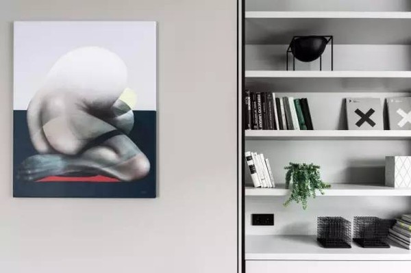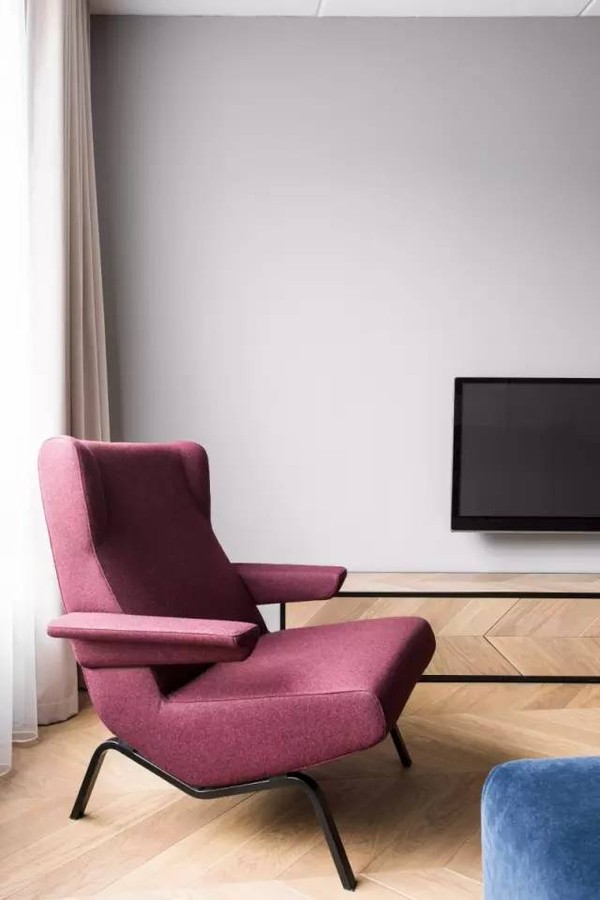 客厅配有天鹅绒蓝沙发和质感强烈的红色椅子,所有的墙壁都涂成灰色,黑色金属的坚硬细节被家具的色彩抵消,强烈的色彩又被一个平坦的背景中和,所谓“相得益彰”可能就是这个意思