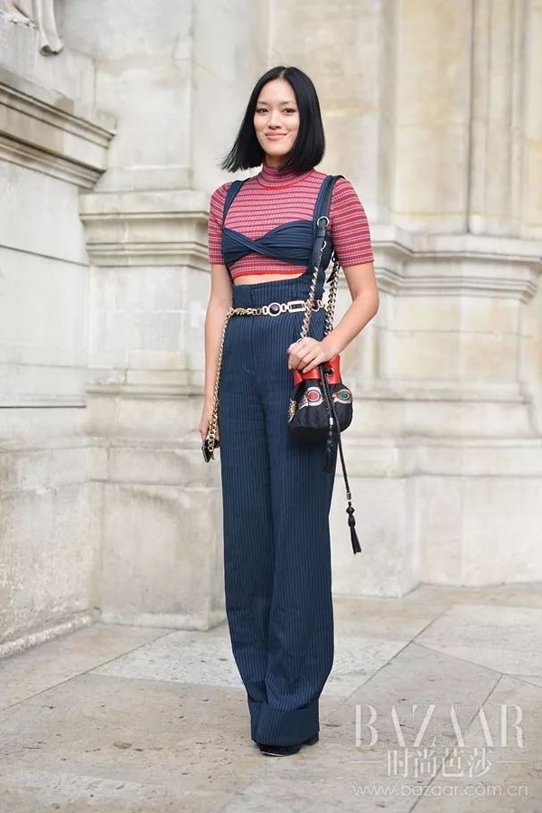 总攻力MaX的马思纯同样用针织材质的跟特殊不对称领设计的衬衫叠在一起,加上宽腰封,有了胸以下都是腿的既视感。