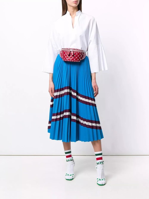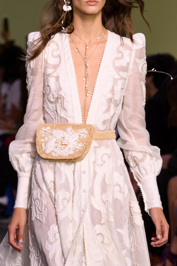 与之相比,更多品牌在本季为腰包换上了质感更加精致的新形象。Sportmax的长方形小牛皮腰包简约大方;Rochas的提花信封腰包和Zimmermann的编织刺绣腰包,让这件以往流行于街头的单品也具有了文艺清新的成熟气质;Givenchy、Versace和Valentino的腰包,不妨说是将一款精致的迷你手袋挂在了身上,化身最吸引眼球的那件优雅配饰。