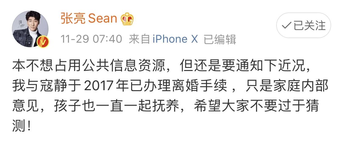 “本不想占用公共信息资源,但还是要通知下近况,我与寇静于2017年已办理离婚手续 ,只是家庭内部意见,孩子也一直一起抚养,希望大家不要过于猜测!”