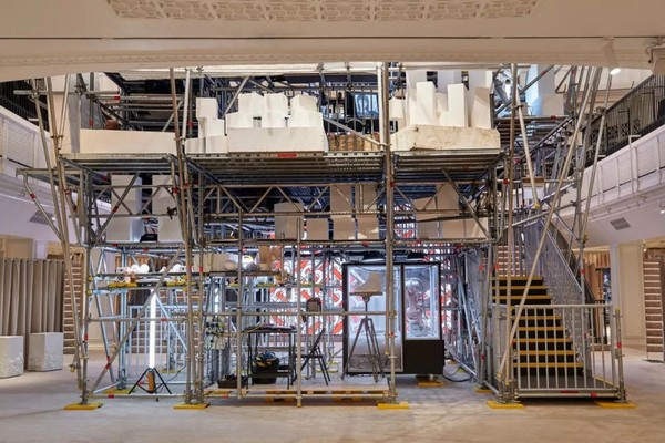 在这栋前身为剧院的建筑里,每个空间都装饰有垂坠的遮光幕布,地板上铺上了厚重的地毯。中心位置限时摆放的是出自英国艺术家 Graham Hudson 之手的三层支架结构沉浸式交互艺术装置《西西弗斯的斜坡》。该装置将店铺主厅改造成了一个展示空间,生动诠释了将声音与视觉概念相结合的雕塑形态。富有革新精神的店铺视觉形象能够激发大众对品牌风格文化的认知,并深切感受其可变性。
