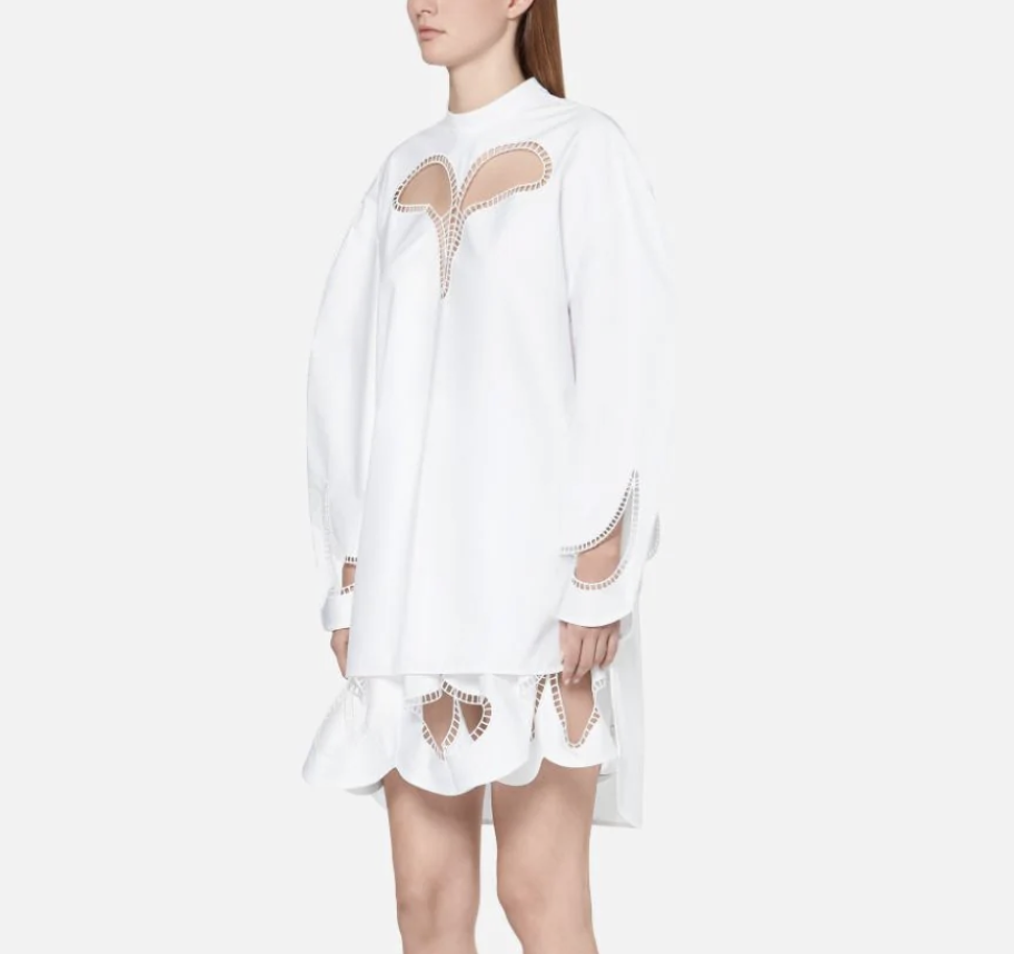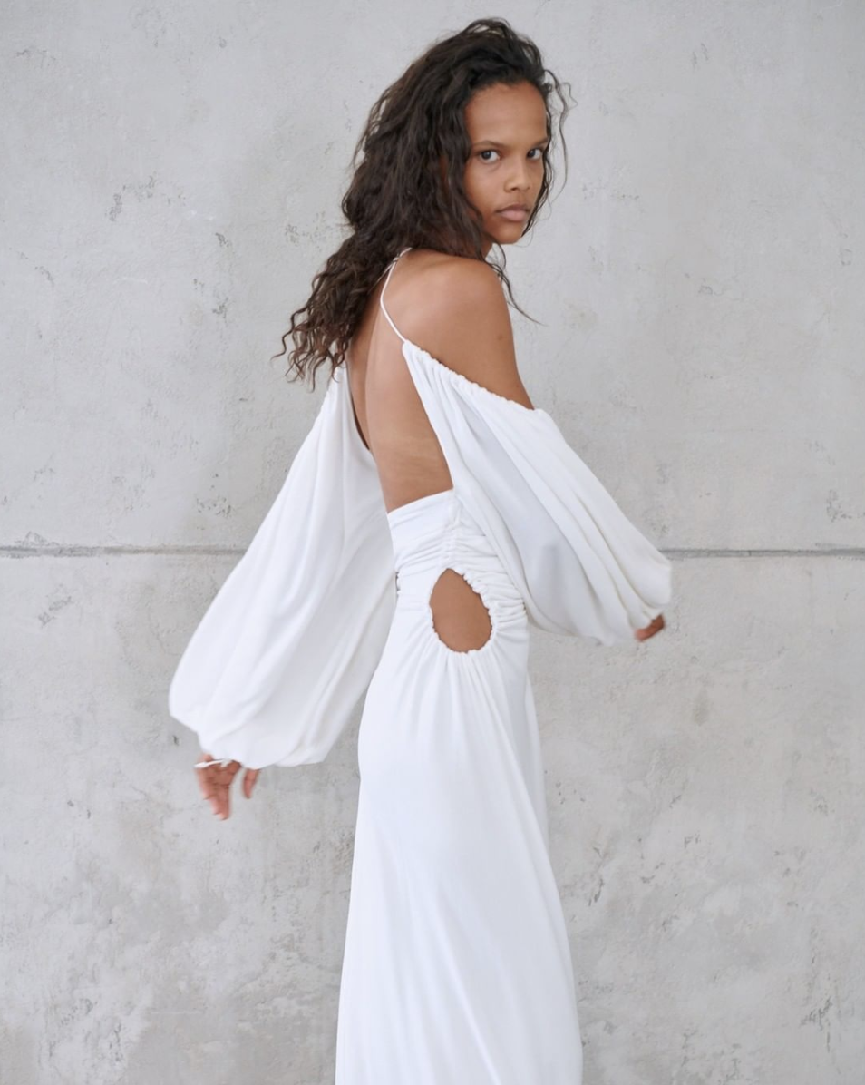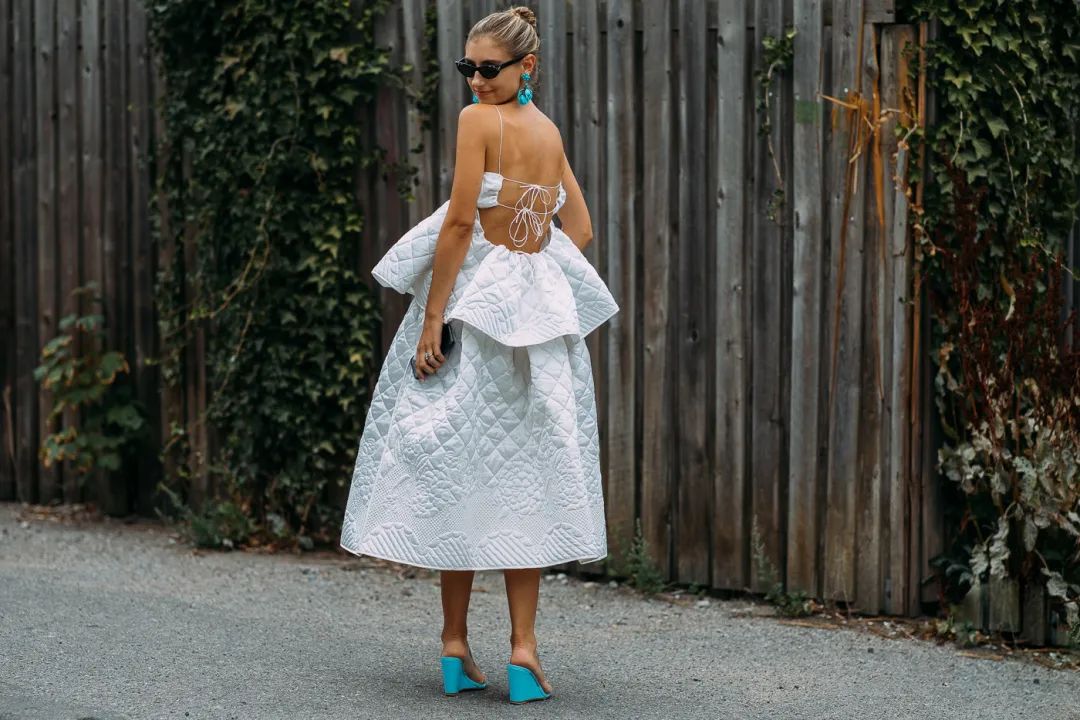 除了基本的半露肩膀款,腰身肚脐短款与膝盖开口款等操作,今年更流行一些出其不意的镂空设计。