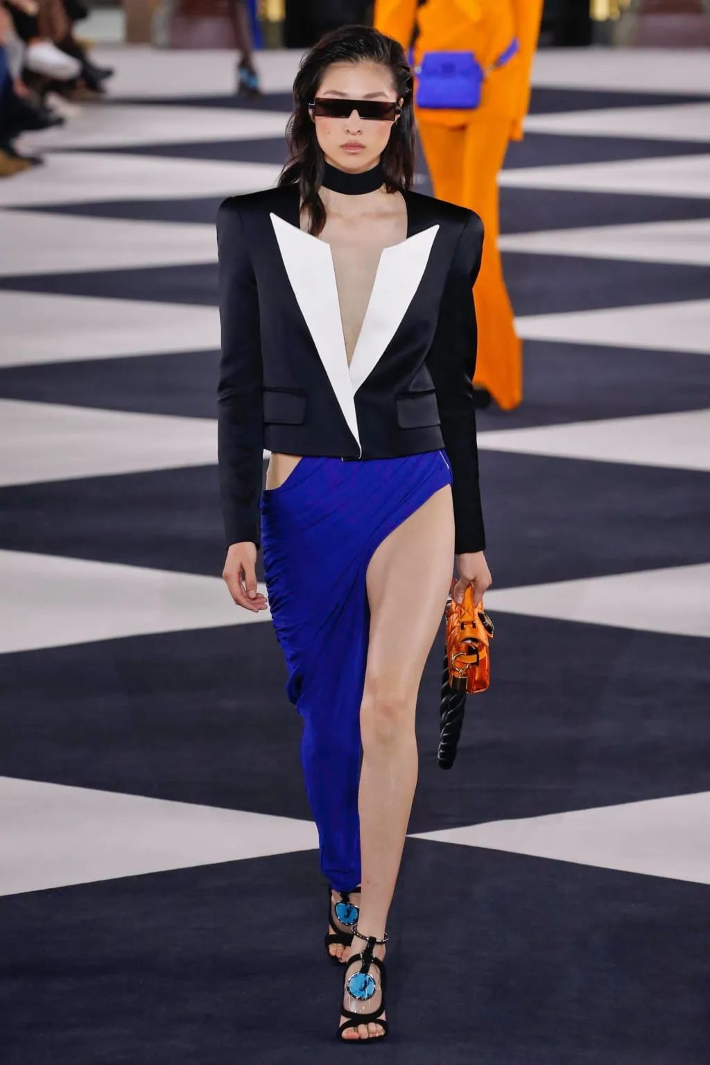 几何镂空廓形被大量运用在成衣裙装中,掺入了现代的光感,浓烈鲜亮不失性感。