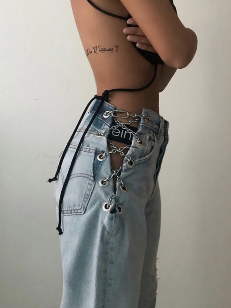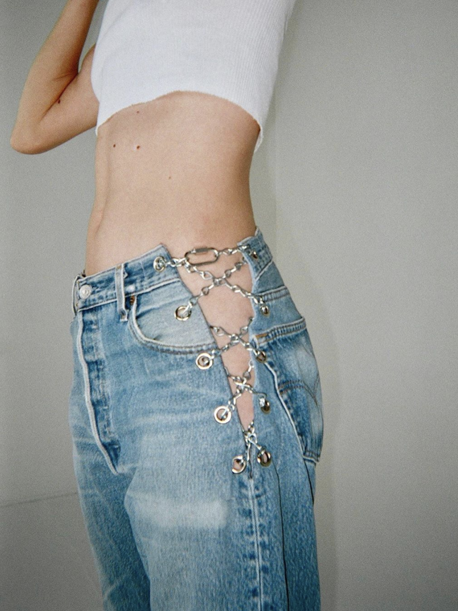 而小众品牌EB Denim在胯部镂空设计这方面也是很有新意,喜欢用链条来和裤子结合,他们家这条经典的裤子,出镜率也是很高。