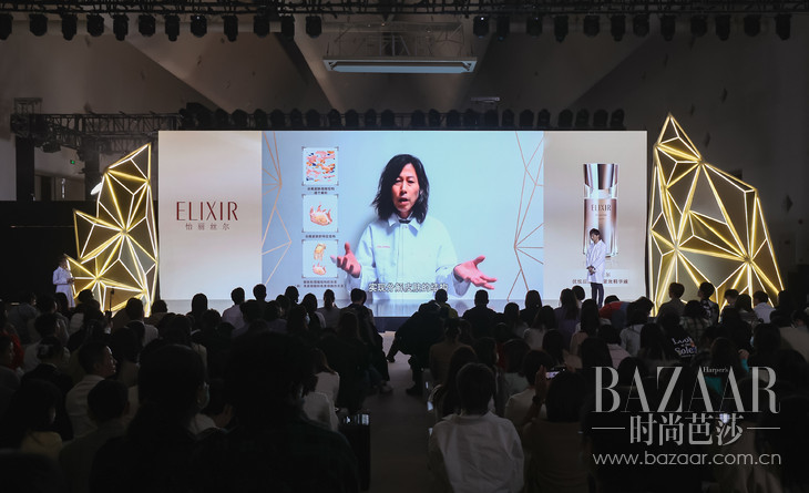 现场精彩的装置及环节设置也让全场嘉宾惊喜不断。全场金色灯光与光晕渲染的装置仿佛让人置身“水玉光”般的盈润空间;充满AI科技感的黑科技长廊,帮助嘉宾在一入场时便能了解自身肌肤情况和可能有的肌肤衰老表现;而走入黑科技实验室,来宾们更能直接观看到不同年龄下的肌肤衰老表现,直观感受到人脸结构变化,深入了解AI黑科技、弹力支撑网、4周改善松弛等各项数据及相关资料,更能通过H5将相关资讯一键植入自己的手机中便于查看,为现场来宾带来惊艳的高科技线上发布会体验。