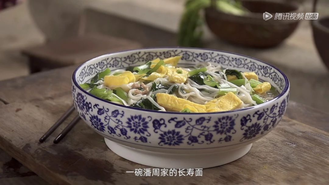 前期制面虽为繁琐,但煮面再简单不过,青菜、鸭蛋、肉沫汇集于青花大碗中,便是一碗清爽适口的潘周家长寿面。