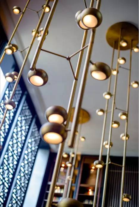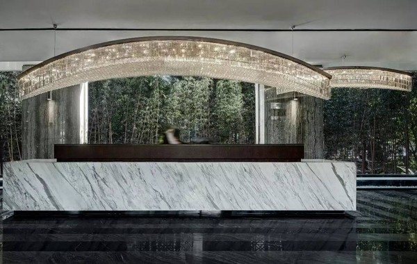 线条构成的弧形水晶灯,其灵感来源于一轮新月,其更重要的意义是“月光下,竹林处”的另一种解读