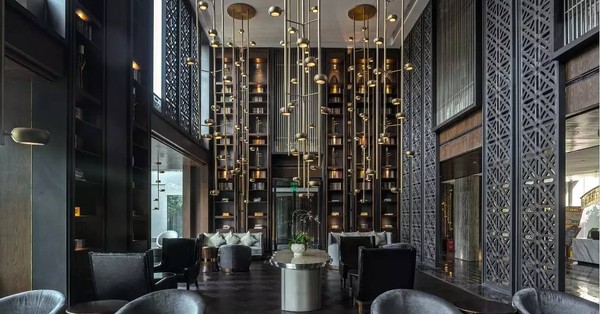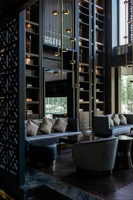 被极端拉高的书柜尺度感,更应是一种人文气节的延续,这种毫无风格化的书柜样式,凭借着直立于天的形态,包围着整个大堂的气韵,这便是东方不可一世的一面