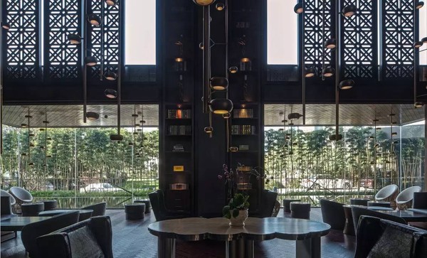 大堂背景采用半通透的表现形式,将户外大片竹林引景入室,给客人营造一种舒适的氛围,静坐在大堂吧落地窗边的沙发上,视线被竹林与水镜的倒影充盈,茶驿中独特的天井设计,为客人提供更多的自然体验,丰富设计的趣味性