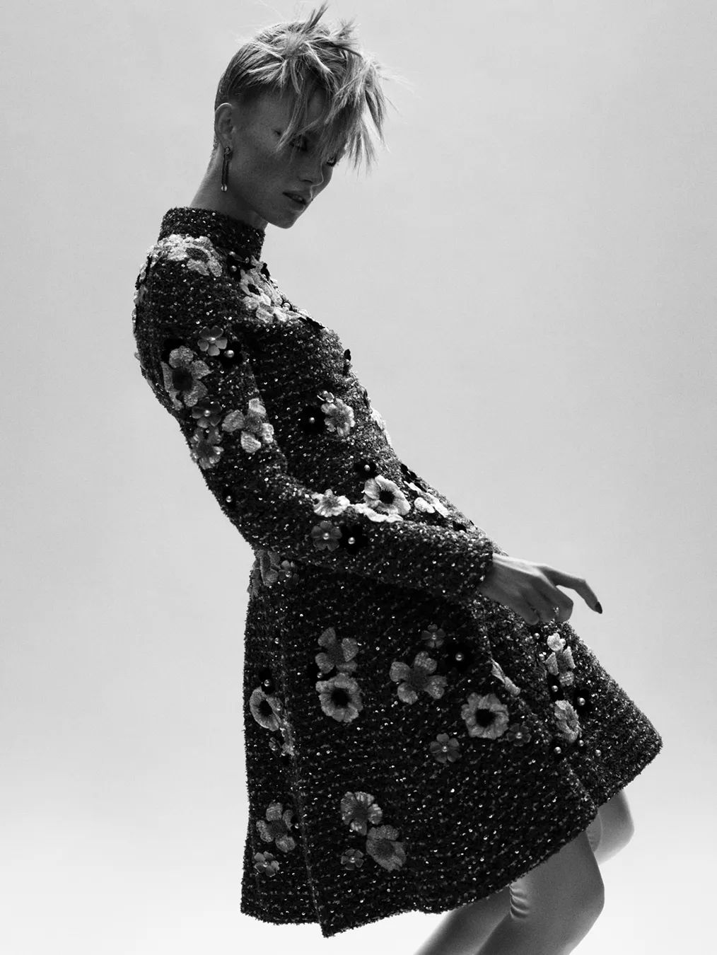 半透视的轻纱伴以精致刺绣,用高级的细节刻画给人无限幻想与憧憬,在黑白映像中,闪烁着耀眼的光芒。