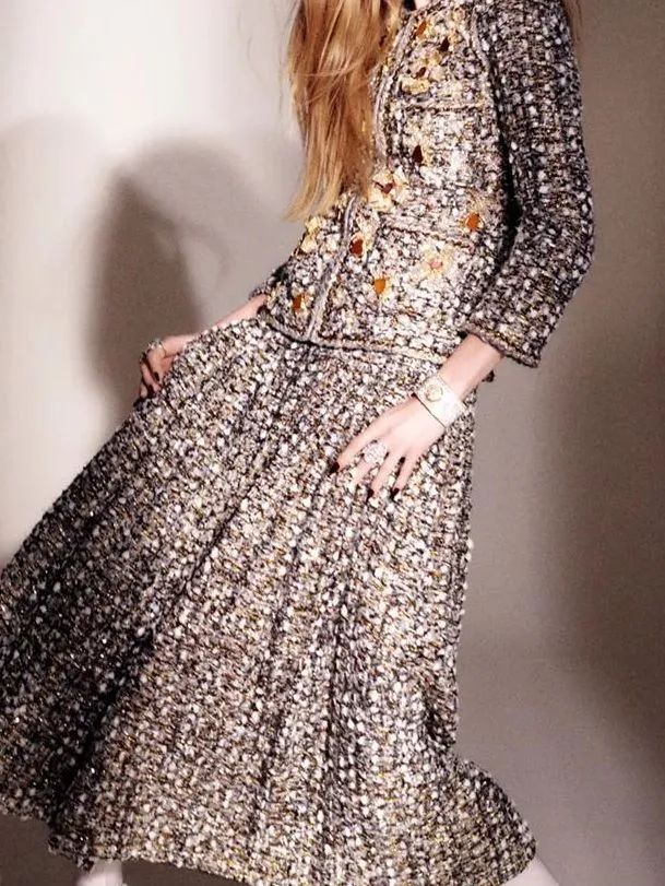 Lesage刺绣坊、Montex刺绣坊与Lemarié山茶花及羽饰坊、Goossens金银饰坊全部投入到对斜纹软呢的创新制作中,亮片、水钻、宝石和珠子等元素都为其增添华美的特性。