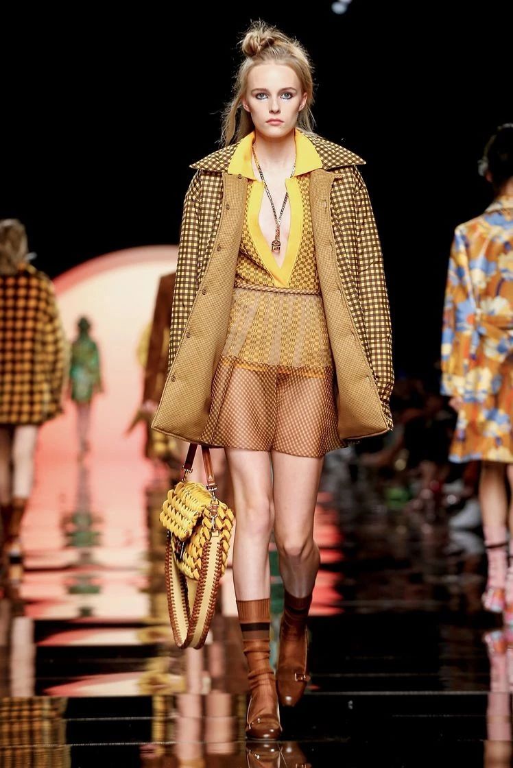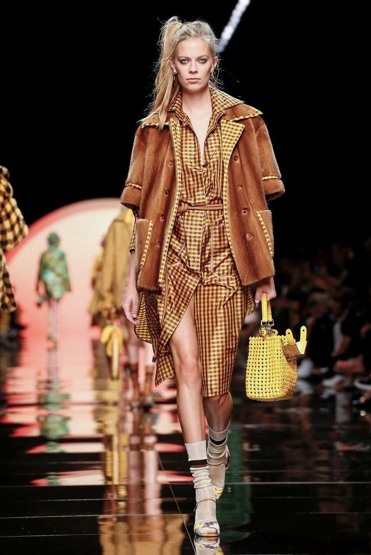 在印花之外,Fendi经典的格纹元素再次回归,自带天然气息的维希格纹出现在皮草外套、夹克、短裤甚至内衬上,混搭着丝绒半裙和尖领衬衫,整体造型复古又有趣。