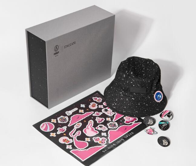 除此之外,中国航天 | STACCATO跨界系列带来全新限量礼盒,航天元素徽章、渔夫帽等周边,丰富的灵感碰撞释放出更多可能性。并配有卡通贴纸可DIY专属定制礼盒,打造创意小宇宙!礼盒可回收用于收纳,为环保助力。心系太空,关爱地球。