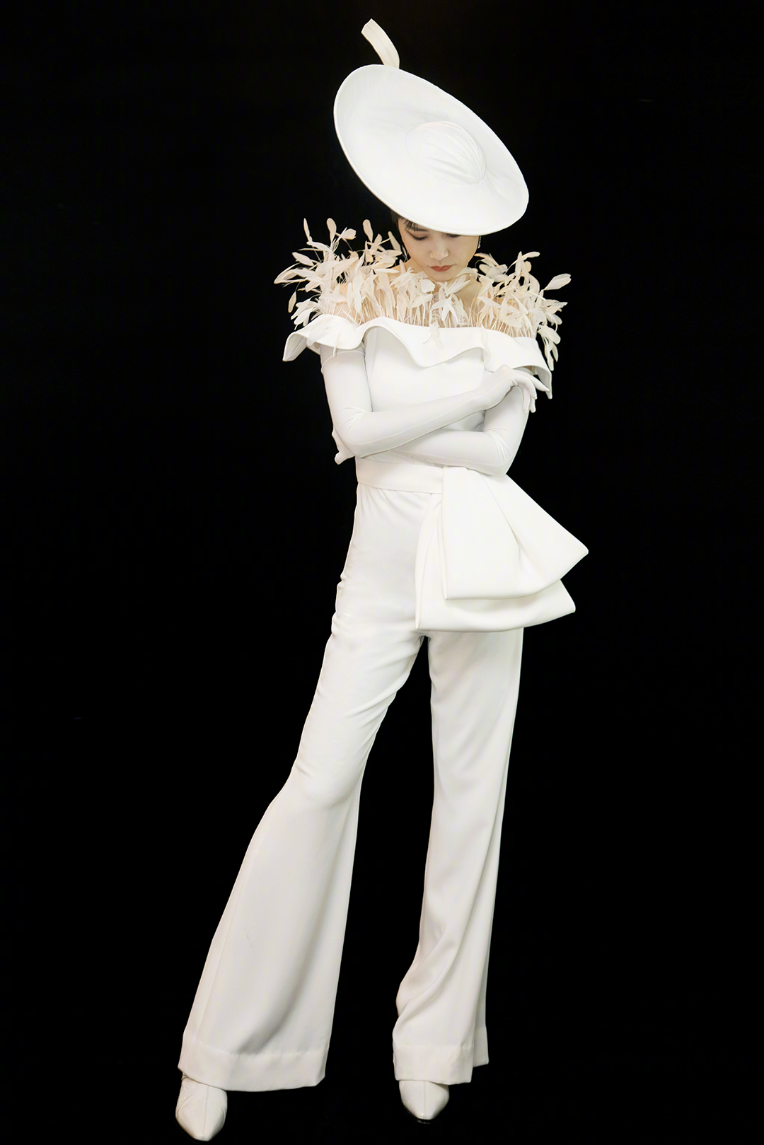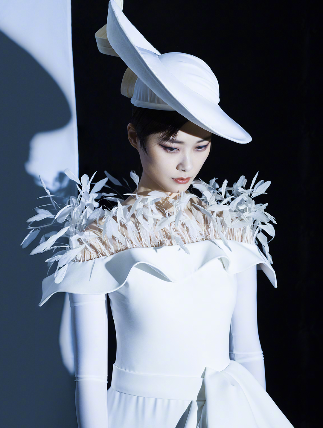 利用褶皱打造的贝壳面平顶帽,带着18-19世纪的复古之雅。不愧是让国外时尚媒体也垂怜的春春,这股气质绝了。