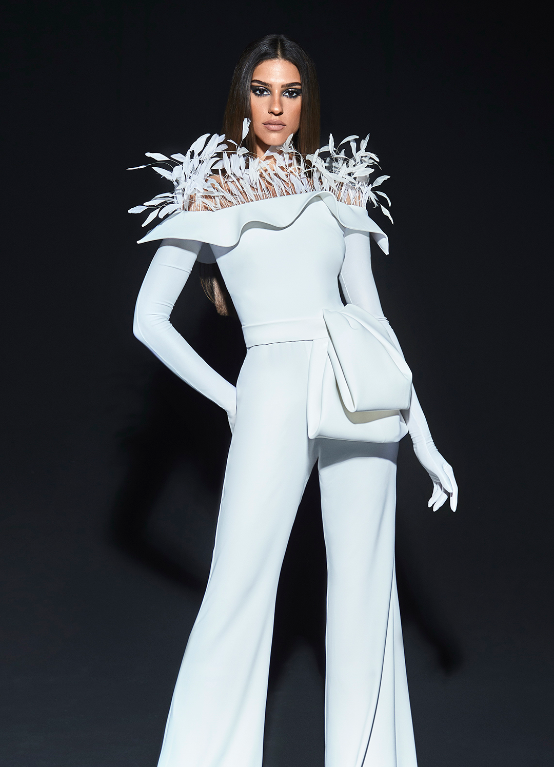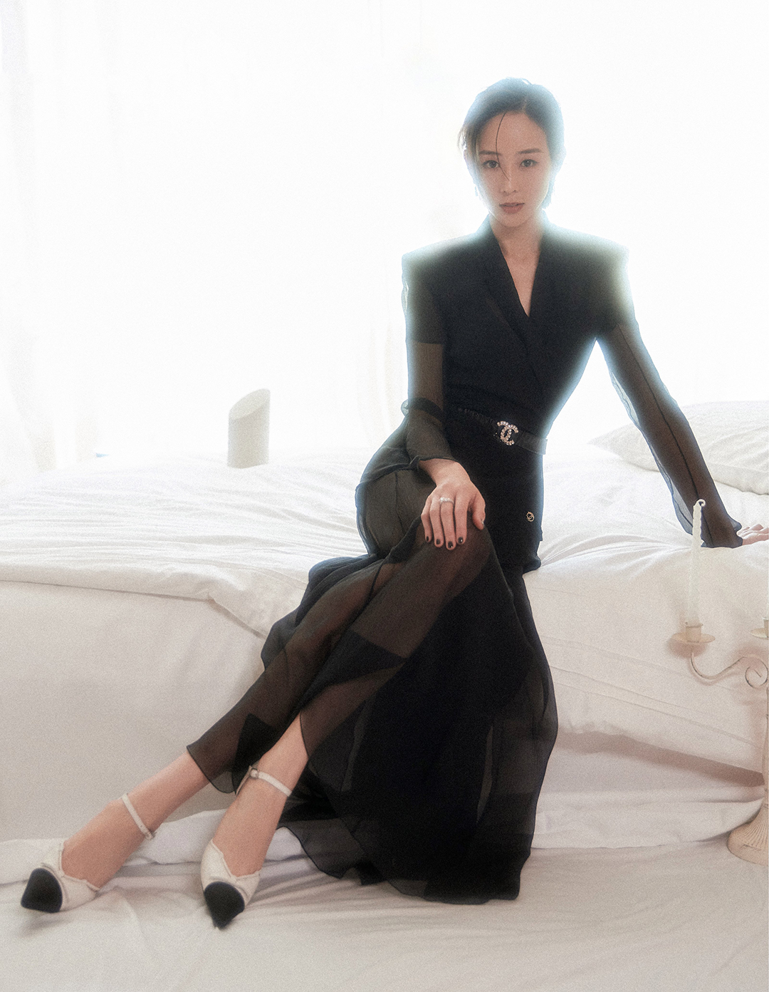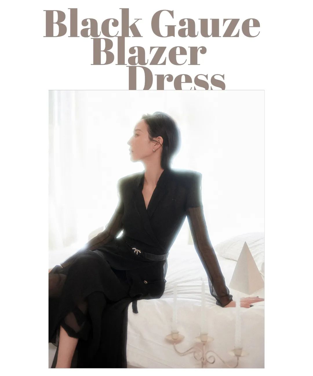 透视长袖与透视裙摆在飘逸感中又垂坠十足,使得整体造型在帅气利落中又显出一份女性温和、柔美之感。